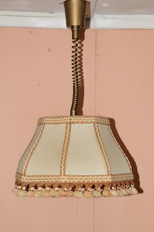 Stahovací lustr s textilním stínítkem béžové barvy s hnědým olemováním a růžovobílými třásněmi. Průměr stínítka 45cm, výška 25cm.