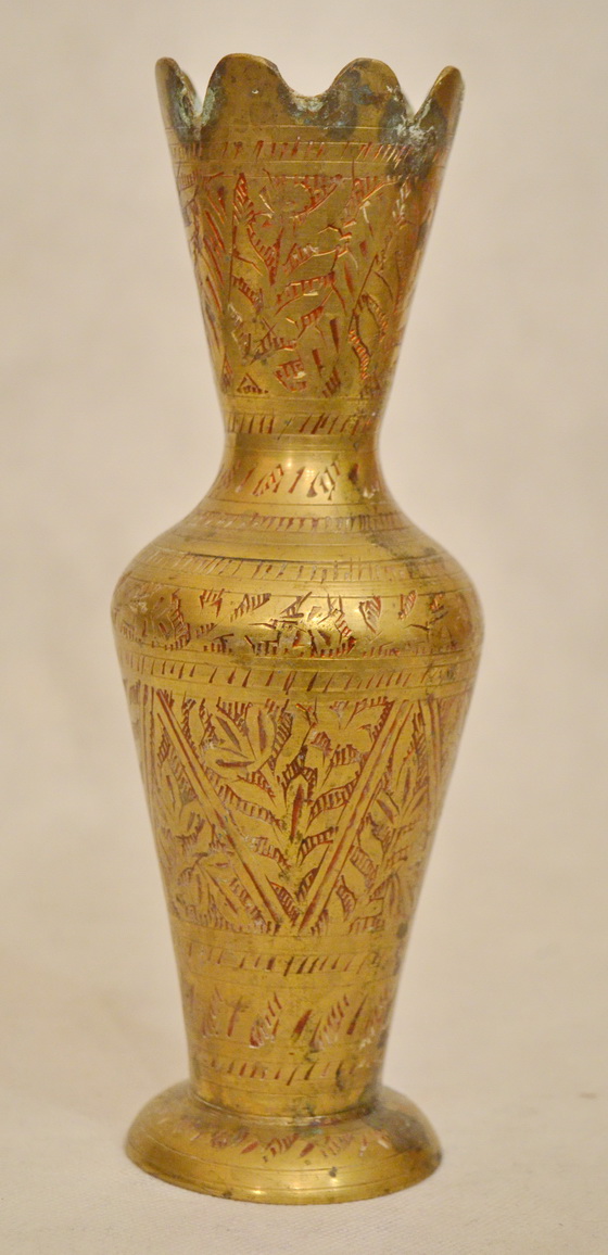 Mosazná váza gravírovaná barevná, výška 25cm, šířka 7cm, skladem 1ks