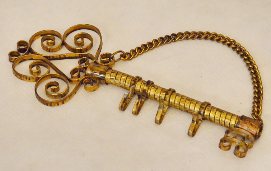 Mosazný věšák Klíč zlatý nástěnný do předsíně, rozměry 24x10cm, skladem 1ks