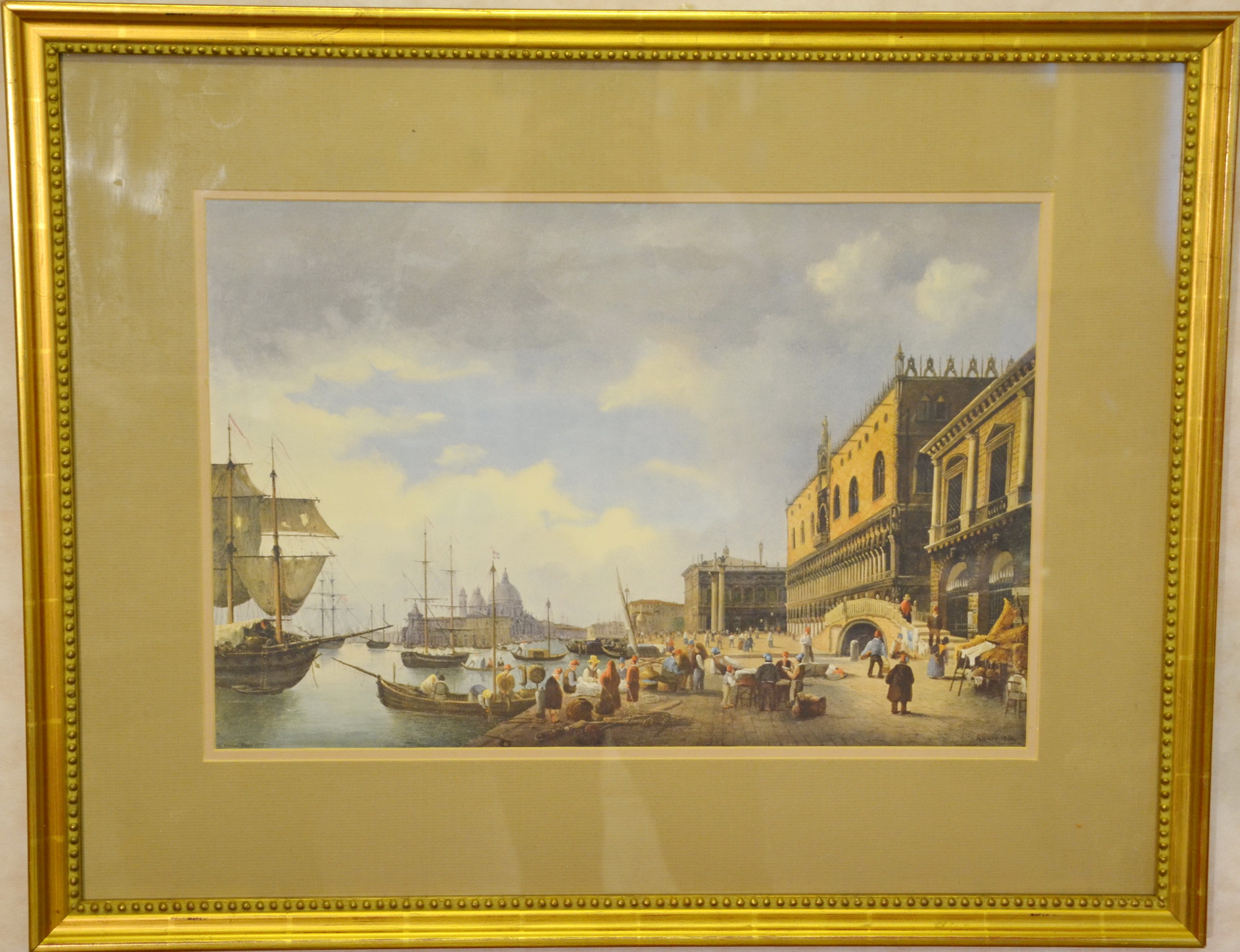 Obraz Riva della Schiavone - Lorenzo Aliani, Benátky 1844, obraz je pod sklem, zlatý dřevěný rám, vroubkovaný, rozměry 75,5x59,5cm, dovoz Anglie