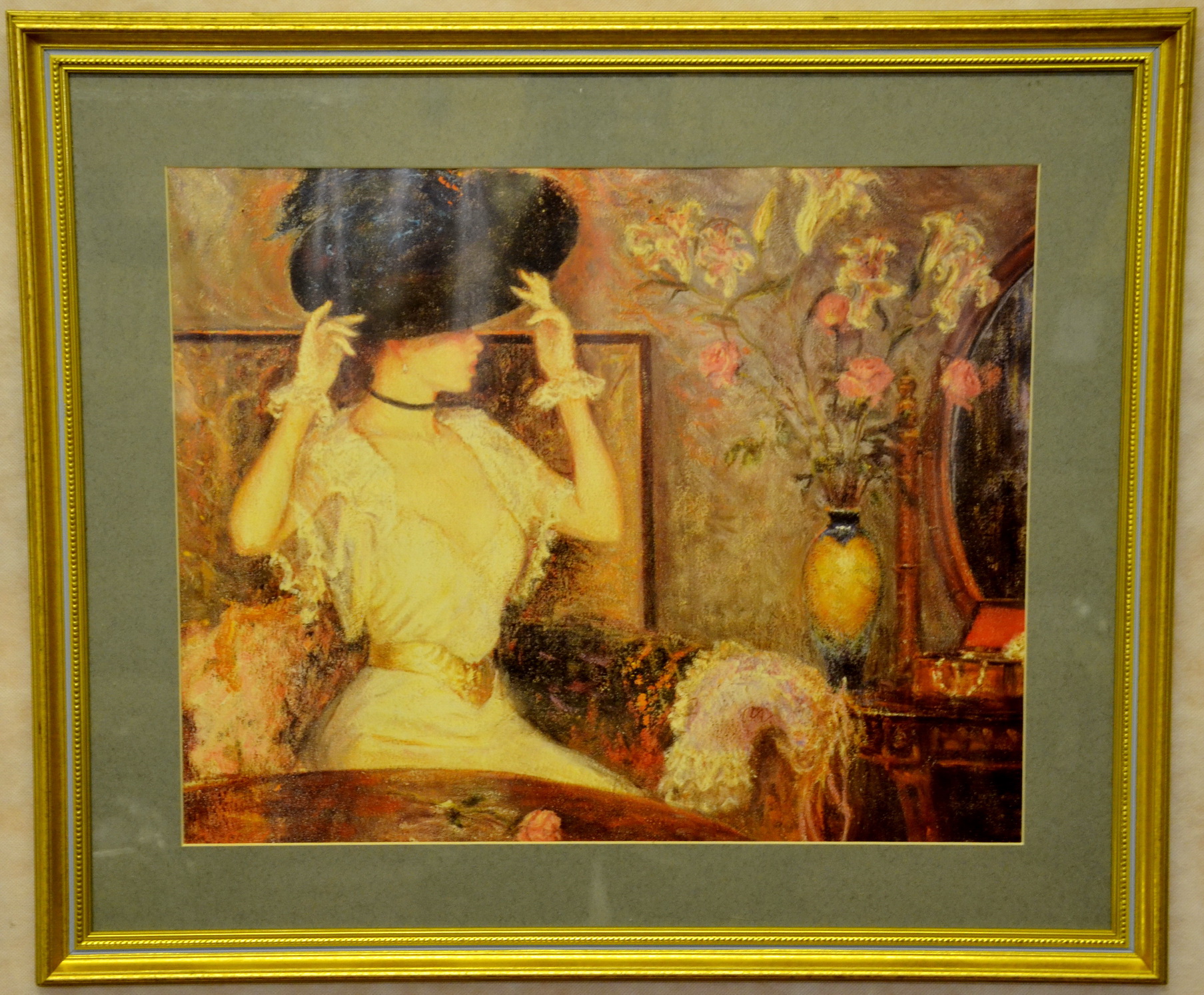 Obraz žena v klobouku pod sklem, krásný zlatý dřevěný rám, rozměry 67x56cm, dovoz Anglie
