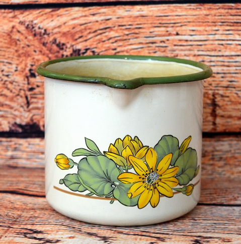 Smaltovaný plechový hrnec béžový s květy, šířka 15,5cm, výška 12cm, skladem 1ks
