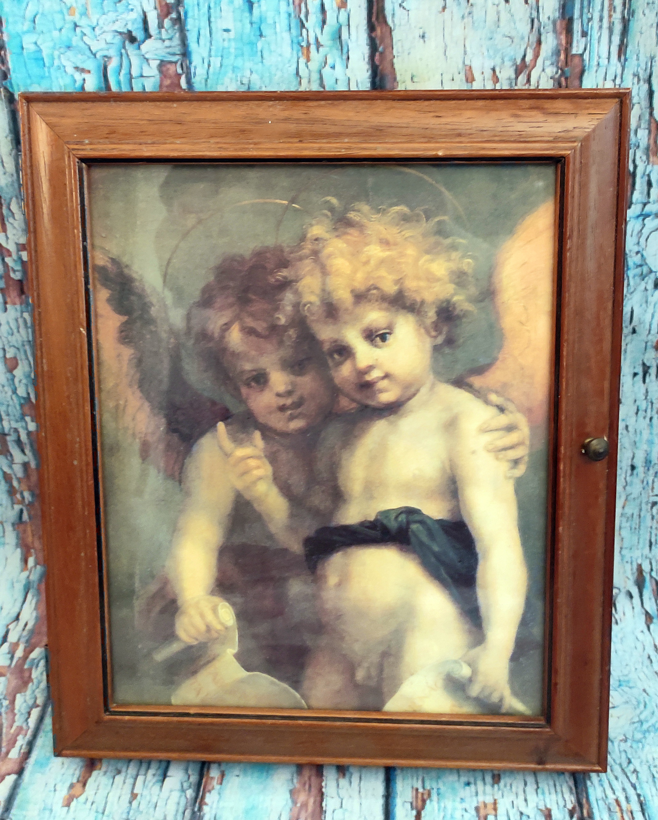 Rustikální dřevěná skříňka na klíče - Andělé, rozměry 37x30x8cm, obrázek je pod sklem, dá se vyměnit za jakýkoliv jiný obrázek