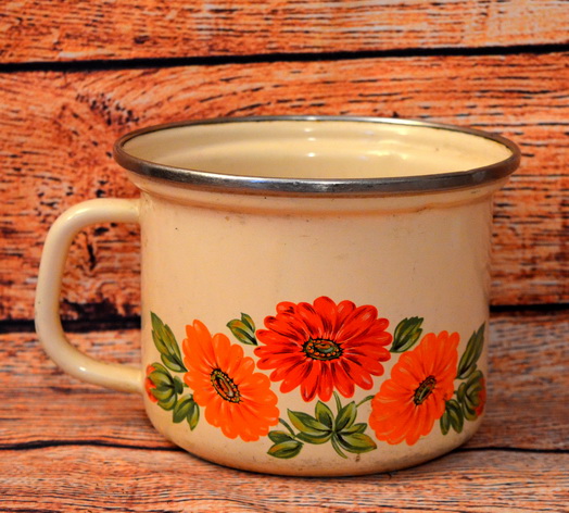 Plechový smaltovaný hrnek 12,5cm šířka, výška 12cm, skladem 1ks