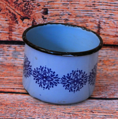 Plechový smaltovaný hrnek 12,5cm šířka, výška 12cm, skladem 1ks